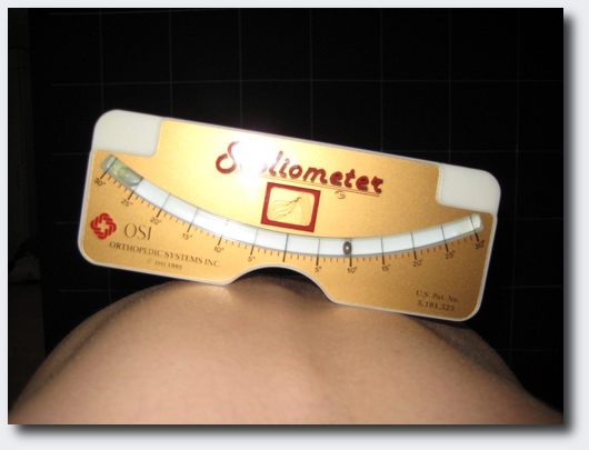 Another diagnostic method is the measurement with a scoliometer. The scoliometer measures the degree of rotation (after Bunell) for each curve. It is a good possibility to measure the spine in short periods and to observe the changes of the spine. |
